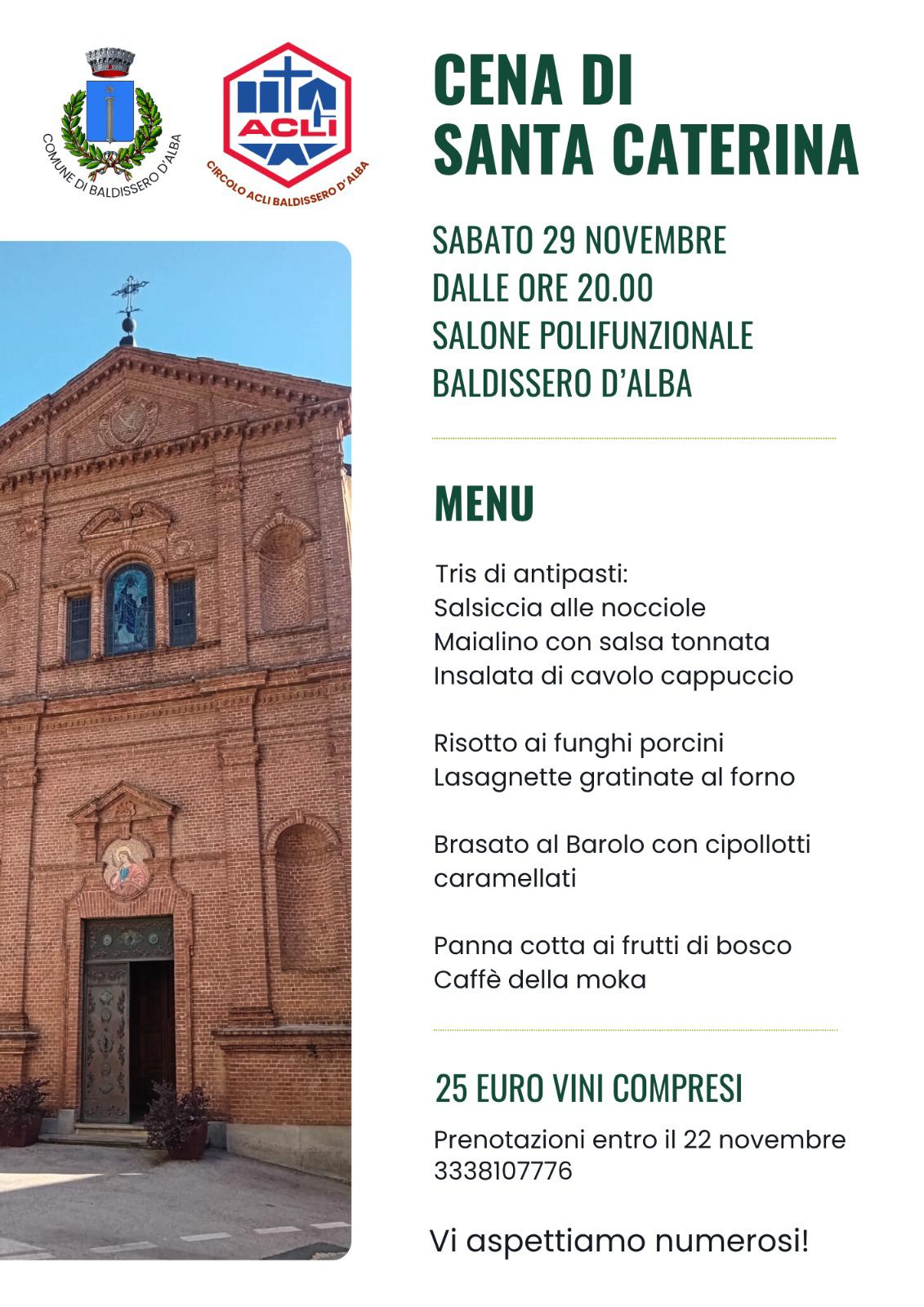 Descrizione in allegato troverete i programmi, menù e presentazione serata del teatro : sabato 22 novembre: presentazione UNITRE presso salone polifunzionale venerdì 28 novembre: presso Salone Polifunzionale, la compagnia "il nostro teatro di Sinio" presenta N'EUV D' DOI ROSS sabato 29 novembre: cena di Sanata CAterina presso il salone polifunzionale con menù composto da 3 antipasti, 2 primi, secondo, dolce e caffé 25 euro domenica 30 novembre: terza edizione mercatini di Natale dalle 9 alle 18 presso piazza Martiri